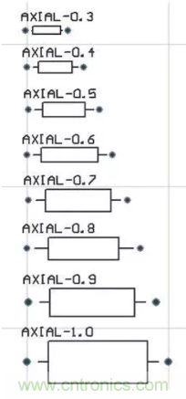 可以選用“RES1”、“RES2”、“RES3”、“RES4”中任何一個,對應的電阻封裝為AXIAL係列,比如“AXIAL-0.3”到“AXIAL-0.7”,其中0.4和0.7指電阻封裝的焊盤間距,一般用“AXIAL0.4”封裝。
