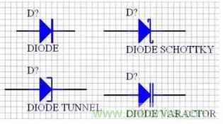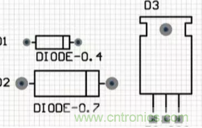 二極管的原理圖符號為“DIODE”,對應的二極管的封裝為封裝屬性係列,如“DIODE-0.4”(小功率)到“DIODE-0.7”(大功率),其中0.4和0.7指二極管的焊盤間距,一般用“DIODE0.4”。值得一提的是,普通的發光二極管的元器件封裝為“RB.1/.2”。