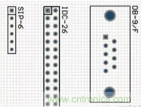 (c)整流橋的元器件封裝形式 圖F1-18 常用的整流橋 (7) 接插件。在電路板設計中,經常用到的接插件有單排插座、雙排插座和一些專用的接口等,如圖F1-19所示。