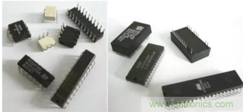 圖F1-20 雙列直插式集成電路芯片 在電路板調試過程中,常常在電路板上焊接IC座,然後將集成電路芯片插在IC座上,這樣可以方便集成電路芯片的拆卸。圖F1-21所示為常用的IC座,其對應的元器件封裝如圖F1-22所示。