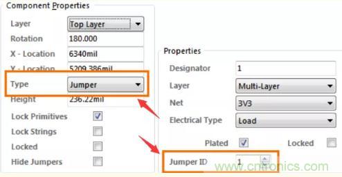 1.要設置為跳線的組件類型。2.跨接導線組件中的兩個極板的跳線ID設置為相同的非零值。注:一旦設置了組件類型和襯墊跳轉屬性,組件就會表現為跳線器。