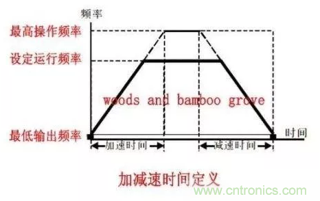 加速時間是指變頻器從【輸出最低頻率】(可設置如台達01-00參數)加速到【最高操作頻率】(可設置,如台達01-05參數)所需時間。