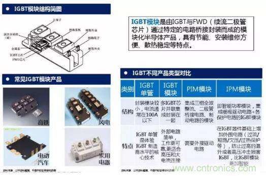 IGBT模塊是由IGBT與FWD(續流二極管芯片)通過特定的電路橋接封裝而成的模塊化半導體產品,具有節能、安裝維修方便、散熱穩定等特點。