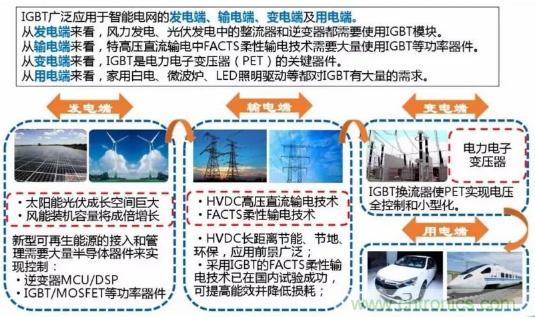 IGBT廣泛應用於智能電網的發電端、輸電端、變電端及用電端: