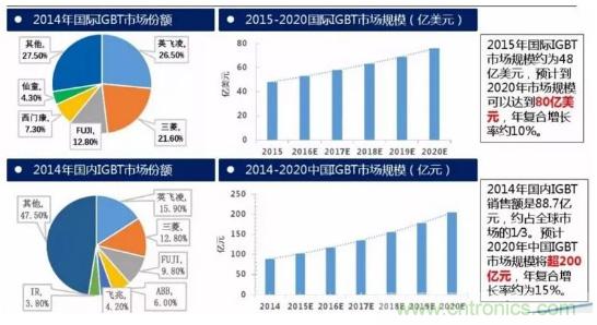 2015年國際IGBT市場規模約為48億美元,預計到2020年市場規模可以達到80億美元,年複合增長率約10%。2014年國內IGBT銷售額是88.7億元,約占全球市場的1∕3。預計2020年中國IGBT市場規模將超200億元,年複合增長率約為15%。