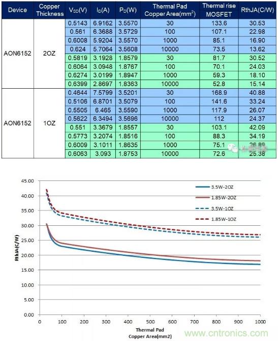 下麵分別以一塊10cmX10cm、2OZ覆銅的二層PCB板來做試驗,板厚1.5mm,PCB底層覆銅沒有通過過孔連接到頂層,將封裝為DFN5*6器件AON6152焊接在PCB板,同時AON6152的D極下麵分別鋪設四種不同尺寸的銅皮:30mm2、100mm2、1000mm2、10000mm2。然後給四塊板的AON6152灌入相同的功率,測量AON6152的溫升,計算相應的熱阻RJA。將AON6152灌入功率減小一半,重複上麵的實驗,測量其溫升,再次計算相應的熱阻RJA。