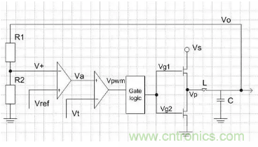 當Vo上升時,V+將上升,Va下降,Vpwm占空比下降,經過們邏輯之後,Vg1的占空比下降,Vg2的占空比上升,Vp占空比下降,這又導致Vo降低,於是Vo的上升將被抑製。反之亦然。