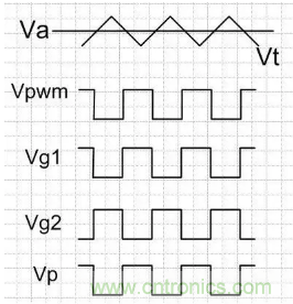 誤差放大器的正端Vref是一恒定的電壓,而PWM放大器的負端Vt是一個三角波信號,一旦Va比三角波大時,Vpwm為高;Va比三角波小時,Vpwm為低,因此Va與三角波的關係,決定了方波信號Vpwm的占空比;Va高,占空比就低,Va低,占空比就高。經過處理,Vg1與Vpwm同相,Vg2與Vpwm反相;最終L左端的方波電壓Vp與Vg1相同。如下圖