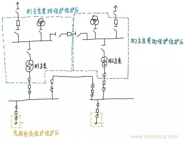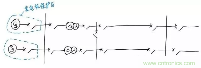 同tong理li,對dui於yu後hou麵mian的de升sheng壓ya變bian壓ya器qi,斷duan開kai變bian壓ya器qi兩liang側ce的de斷duan路lu器qi可ke以yi實shi現xian切qie除chu變bian壓ya器qi而er不bu切qie除chu其qi它ta元yuan件jian,所suo以yi保bao護hu範fan圍wei就jiu是shi變bian壓ya器qi兩liang側ce斷duan路lu器qi旁pang邊bian的de電dian流liu互hu感gan器qi圍wei成cheng的de範fan圍wei。