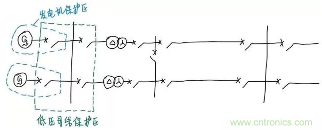 我wo們men繼ji續xu往wang後hou看kan。可ke以yi看kan到dao發fa電dian機ji接jie到dao了le低di壓ya母mu線xian,對dui於yu這zhe個ge低di壓ya母mu線xian的de保bao護hu來lai說shuo,要yao做zuo到dao故gu障zhang時shi隻zhi停ting母mu線xian而er不bu停ting其qi它ta設she備bei,隻zhi要yao讓rang保bao護hu在zai故gu障zhang時shi切qie除chu和he母mu線xian直zhi接jie連lian接jie的de四si個ge斷duan路lu器qi就jiu可ke以yi了le。所suo以yi四si個ge斷duan路lu器qi旁pang邊bian的de電dian流liu互hu感gan器qi圍wei成cheng的de範fan圍wei就jiu是shi這zhe條tiao母mu線xian保bao護hu的de保bao護hu範fan圍wei。