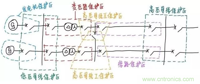 然(ran)後(hou)是(shi)變(bian)壓(ya)器(qi)連(lian)接(jie)的(de)高(gao)壓(ya)母(mu)線(xian)。這(zhe)條(tiao)母(mu)線(xian)是(shi)分(fen)段(duan)的(de),我(wo)們(men)希(xi)望(wang)哪(na)段(duan)母(mu)線(xian)發(fa)生(sheng)故(gu)障(zhang)就(jiu)隻(zhi)切(qie)這(zhe)段(duan)母(mu)線(xian)而(er)不(bu)切(qie)另(ling)一(yi)段(duan),所(suo)以(yi)每(mei)段(duan)母(mu)線(xian)都(dou)需(xu)要(yao)一(yi)個(ge)單(dan)獨(du)的(de)保(bao)護(hu)區(qu)。按(an)照(zhao)上(shang)文(wen)的(de)分(fen)區(qu)原(yuan)則(ze),我(wo)們(men)可(ke)以(yi)很(hen)容(rong)易(yi)地(di)確(que)定(ding)出(chu)高(gao)壓(ya)母(mu)線(xian)和(he)輸(shu)電(dian)線(xian)路(lu)的(de)保(bao)護(hu)區(qu),如(ru)下(xia)圖(tu):