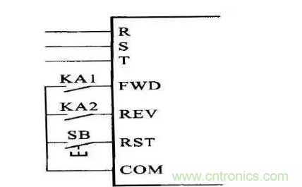 3、找到變頻器的控製端子,在外麵加裝2個中間繼電器,分別是KA1與KA2,接線方法如下圖所示,KA1工作時,變頻器正轉,KA2工作時,變頻器反轉,SB是複位按鈕,當有異常報警時,變頻器會停機,此時按下RST,可以消除報警,然後再重新啟動變頻器。