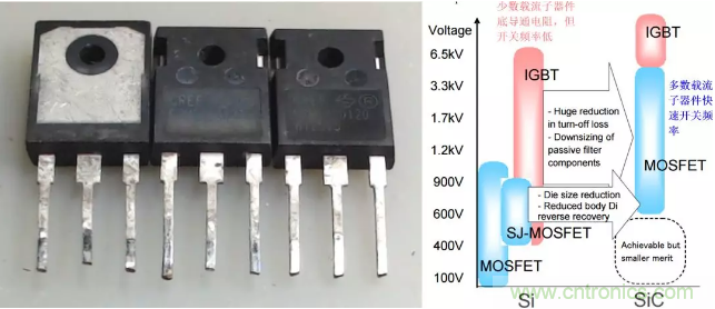 由SiC製作的MOSFET耐壓高,或者在同樣的耐壓要求下,MOSFET的尺寸就小,從而大大降低了MOS管的導通電阻和傳熱熱阻。