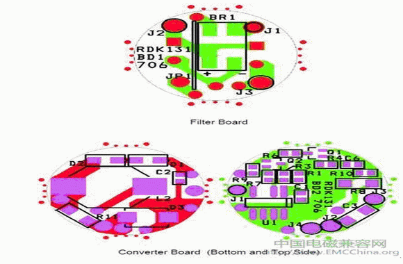 雖然該設計具有功能性,但仍存在傳導輻射問題。由於兩個PCB比較接近,開關電流會從轉換器電路板耦合到EMI濾波器電路板,從而降低EMI濾波器的性能。通過在這兩個電路板之間放置“屏蔽”PCB,這一問題便得以解決。而第三個電路板隻是一層銅,並無電路。它被電氣連接到EMI濾(lv)波(bo)器(qi)負(fu)輸(shu)出(chu)端(duan)與(yu)轉(zhuan)換(huan)器(qi)負(fu)輸(shu)入(ru)端(duan)的(de)接(jie)合(he)處(chu)。這(zhe)樣(yang),總(zong)裝(zhuang)便(bian)由(you)三(san)個(ge)疊(die)加(jia)在(zai)一(yi)起(qi)的(de)圓(yuan)形(xing)電(dian)路(lu)板(ban)組(zu)成(cheng)。增(zeng)加(jia)第(di)三(san)個(ge)電(dian)路(lu)板(ban)既(ji)簡(jian)單(dan)又(you)節(jie)省(sheng)成(cheng)本(ben),不(bu)但(dan)解(jie)決(jue)了(le)耦(ou)合(he)問(wen)題(ti),還(hai)達(da)到(dao)了(le)EMI性能要求。