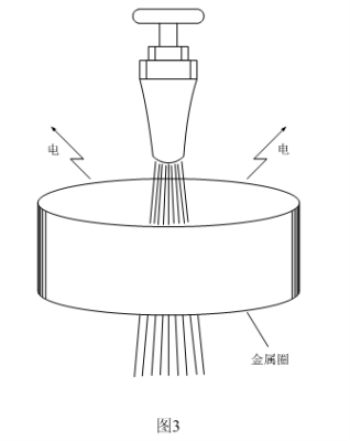 圖3是一個讓物體產生高壓電的原理圖,在水龍頭的下麵安放一個用金屬薄片製作的圓圈(用金屬罐頭盒改製),金(jin)屬(shu)圓(yuan)圈(quan)必(bi)須(xu)要(yao)與(yu)周(zhou)圍(wei)絕(jue)緣(yuan),然(ran)後(hou)讓(rang)水(shui)龍(long)頭(tou)流(liu)出(chu)的(de)水(shui)正(zheng)好(hao)從(cong)金(jin)屬(shu)圓(yuan)圈(quan)的(de)中(zhong)央(yang)穿(chuan)過(guo),金(jin)屬(shu)圓(yuan)圈(quan)很(hen)快(kuai)就(jiu)會(hui)帶(dai)電(dian),並(bing)且(qie)電(dian)壓(ya)非(fei)常(chang)高(gao),一(yi)般(ban)可(ke)達(da)一(yi)萬(wan)伏(fu)以(yi)上(shang)。用(yong)試(shi)電(dian)筆(bi)做(zuo)試(shi)驗(yan)時(shi),當(dang)試(shi)電(dian)筆(bi)離(li)金(jin)屬(shu)圓(yuan)圈(quan)還(hai)很(hen)遠(yuan)的(de)地(di)方(fang),就(jiu)可(ke)以(yi)看(kan)到(dao)試(shi)電(dian)筆(bi)被(bei)點(dian)亮(liang),甚(shen)至(zhi)拿(na)一(yi)個(ge)小(xiao)熒光燈靠近,也可以看得到熒光燈微亮。這說明電壓非常高,但對人體不存在被觸電的危險,因為金屬圓圈的電容量很小,存儲的能量有限。