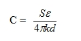 上式中,電容C的單位為法拉,ε為介電常數(在真空中為1),S為帶電物體與參照物體之間電力線互相照射的麵積(與電場垂直,單位米2),在國際單位製中k = 9×109牛頓•米2/庫侖2,d為帶電物體到參照物的有效距離(單位米)。