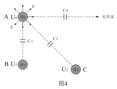 圖4是帶電物體對其它物體產生感應的原理圖。圖4中,A是帶電物體,其電位為U0,E表示電場強度或電場力線,Q0為其帶電量;帶電物體A對物體B和物體C均會產生電場感應,U1和U2分別為物體B和物體C被物體A感應產生的對地電位;Q1和Q2分別為物體B和物體C被物體A感應產生的電荷量。帶電物體A的電荷Q0越多,其電位U0就越高,並且其對物體B或物體C產生感應影響的力度就越大。