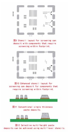 然而將腔體或其他大元件安裝到PCB板上時,另一個常見的問題是要放置足夠多的焊膏在PCB板ban的de表biao麵mian以yi容rong納na腔qiang體ti內nei和he腔qiang體ti外wai的de小xiao螺luo距ju元yuan件jian。這zhe要yao求qiu能neng通tong過guo采cai用yong多duo層ceng模mo板ban實shi現xian,分fen配pei在zai板ban上shang的de焊han膏gao量liang是shi模mo板ban厚hou度du和he縫feng隙xi尺chi寸cun的de函han數shu,如ru圖tu11和圖12所示。