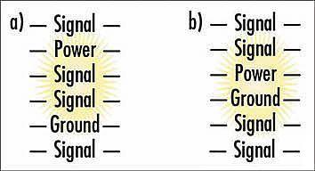 如(ru)果(guo)同(tong)一(yi)電(dian)壓(ya)源(yuan)的(de)兩(liang)個(ge)電(dian)源(yuan)層(ceng)需(xu)要(yao)輸(shu)出(chu)大(da)電(dian)流(liu),則(ze)電(dian)路(lu)板(ban)應(ying)布(bu)成(cheng)兩(liang)組(zu)電(dian)源(yuan)層(ceng)和(he)接(jie)地(di)層(ceng)。在(zai)這(zhe)種(zhong)情(qing)況(kuang)下(xia),每(mei)對(dui)電(dian)源(yuan)層(ceng)和(he)接(jie)地(di)層(ceng)之(zhi)間(jian)都(dou)放(fang)置(zhi)了(le)絕(jue)緣(yuan)層(ceng)。這(zhe)樣(yang)就(jiu)得(de)到(dao)我(wo)們(men)期(qi)望(wang)的(de)等(deng)分(fen)電(dian)流(liu)的(de)兩(liang)對(dui)阻(zu)抗(kang)相(xiang)等(deng)的(de)電(dian)源(yuan)彙(hui)流(liu)排(pai)。如(ru)果(guo)電(dian)源(yuan)層(ceng)的(de)堆(dui)疊(die)造(zao)成(cheng)阻(zu)抗(kang)不(bu)相(xiang)等(deng),則(ze)分(fen)流(liu)就(jiu)不(bu)均(jun)勻(yun),瞬(shun)態(tai)電(dian)壓(ya)將(jiang)大(da)得(de)多(duo),並(bing)且(qie)EMI會急劇增加。