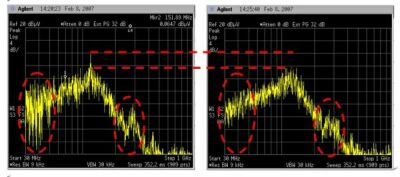 雖然每個器件有不同的中心頻率、頻(pin)率(lv)擴(kuo)展(zhan)和(he)頻(pin)率(lv)變(bian)化(hua)方(fang)法(fa),但(dan)隻(zhi)要(yao)頻(pin)率(lv)的(de)變(bian)化(hua)是(shi)隨(sui)機(ji)的(de),則(ze)峰(feng)值(zhi)輻(fu)射(she)能(neng)量(liang)便(bian)可(ke)被(bei)降(jiang)低(di)。這(zhe)是(shi)由(you)於(yu)電(dian)磁(ci)能(neng)量(liang)傾(qing)向(xiang)散(san)布(bu)在(zai)較(jiao)寬(kuan)闊(kuo)的(de)頻(pin)帶(dai)內(nei),所(suo)以(yi)總(zong)高(gao)頻(pin)能(neng)量(liang)會(hui)如(ru)同(tong)一(yi)個(ge)固(gu)定(ding)頻(pin)率(lv)器(qi)件(jian)一(yi)樣(yang)保(bao)持(chi)不(bu)變(bian),但(dan)在(zai)頻(pin)帶(dai)內(nei)任(ren)何(he)一(yi)點(dian)頻(pin)率(lv)上(shang)的(de)噪(zao)聲(sheng)均(jun)可(ke)被(bei)降(jiang)低(di)。圖(tu)1比較了一個固定頻率器件和一個擴展頻譜器件的近場EMI測(ce)量(liang)結(jie)果(guo)。正(zheng)如(ru)圖(tu)中(zhong)的(de)紅(hong)色(se)線(xian)表(biao)示(shi),峰(feng)值(zhi)能(neng)量(liang)被(bei)減(jian)少(shao)。如(ru)果(guo)實(shi)現(xian)的(de)方(fang)法(fa)正(zheng)確(que),那(na)擴(kuo)展(zhan)頻(pin)譜(pu)可(ke)以(yi)作(zuo)為(wei)一(yi)個(ge)非(fei)常(chang)有(you)效(xiao)的(de)方(fang)案(an),因(yin)為(wei)它(ta)不(bu)會(hui)對(dui)效(xiao)率(lv)和(he)THD造成任何不良的影響。這種技術現已應用在例如LM4675、LM48410和LM48520之類的器件上。