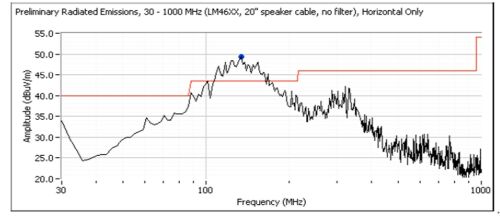 圖3.沒有邊沿速率控製的擴展頻譜D類放大器。器件在EMI測試中,在沒有使用任何濾波器的情況下驅動20英寸長的揚聲器電纜,其結果符合FCCB級的EMI限製。