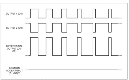 如圖1所示,如果器件的反相和同相輸出回路具有較高的匹配度,則兩個對稱輸出信號波形在揚聲器或連線上將具有很小的共模(CM)信號(底部的跡線)。注意:50%占空比代表零輸入信號(空閑狀態)。因此,可以設計一個差分低通濾波器,用於衰減信號波形中高頻分量(快速切換所產生的),同時保留有用的低頻分量以輸出到揚聲器。