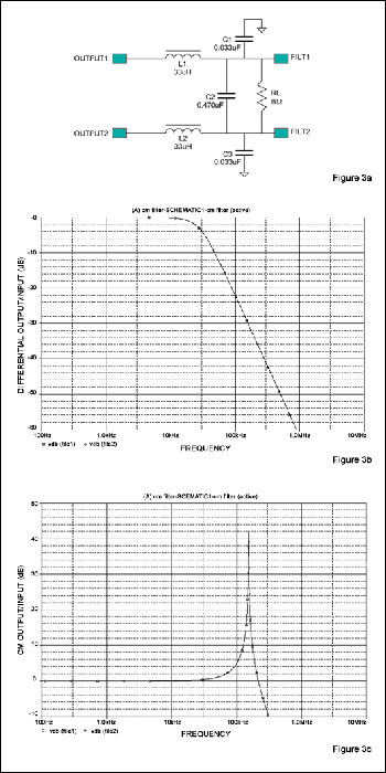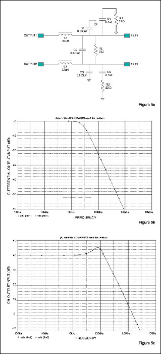 圖5b為圖5a濾波器對差分輸入的響應,圖5c為共模輸入的響應。注意:圖5c中共模截止頻率較高(-3dB帶寬約為110kHz,差分輸入為28kHz),帶有平緩且合理控製的尖峰。該截止頻率遠高於最高音頻(也低於D類開關頻率基波),因此具有較好的效果。