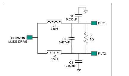 此類D類放大器對輸出濾波器的要求,不同於具有傳統差分輸入和互補PWM輸出的放大器。與PWM相比,MAX9704調tiao製zhi方fang案an的de輸shu出chu往wang往wang含han有you較jiao高gao的de共gong模mo信xin號hao,設she計ji輸shu出chu濾lv波bo器qi時shi需xu要yao考kao慮lv這zhe點dian。正zheng如ru後hou麵mian的de實shi例li所suo示shi,傳chuan統tong差cha分fen濾lv波bo器qi拓tuo撲pu結jie構gou的de效xiao果guo往wang往wang不bu太tai理li想xiang。