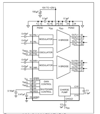圖2.Maxim的MAX9704立體聲D類放大器的調製方案