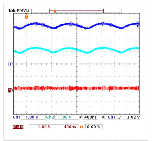 8.頂部跡線顯示了圖5a電路輸出中殘餘的紋波電壓,紋波成分主要為開關頻率基波(此時為940kHz)。濾波器高於該頻點的二階滾降很好的抑製了所有高次諧波。紋波幾乎隻有共模分量(底部的跡線)。