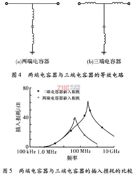 通常采用旁路電容抑製高頻噪聲。實際的電容器不僅具有電容C,還有等效串聯電阻ESR和等效串聯電感ESL。youyujishengdiangandeyingxiang,duiyuyigeshijidedianrongcunzaizhezixiezhenpinlv。zaizhegepinlvyishangshi,dianrongchengganxing。yuanjiandejishengcanshuyehuijidadiyingxianglvboqidegaopintexing。dianrongdejishengdianganshizhuyaodejishengcanshu,erduiyudianganlaishuo,jishengdianrongshizhuyaodejishengcanshu。dianrongqiyongzuopangludianrongshi,rutu4(a)所示,兩端電容器一端接地,另一端與信號線連接。三端電容器一端接地,其餘兩端與電容器的一個電極相連並串聯到信號線上,如圖4(b)所(suo)示(shi)。一(yi)般(ban)的(de)兩(liang)端(duan)電(dian)容(rong)器(qi)由(you)於(yu)與(yu)其(qi)電(dian)路(lu)連(lian)接(jie)的(de)引(yin)線(xian)電(dian)感(gan)或(huo)電(dian)極(ji)所(suo)產(chan)生(sheng)的(de)等(deng)效(xiao)串(chuan)聯(lian)電(dian)感(gan)較(jiao)大(da),所(suo)以(yi)自(zi)諧(xie)振(zhen)點(dian)較(jiao)低(di),旁(pang)通(tong)效(xiao)應(ying)也(ye)隨(sui)之(zhi)降(jiang)低(di)。采(cai)用(yong)三(san)端(duan)電(dian)容(rong)器(qi)可(ke)有(you)效(xiao)改(gai)善(shan)此(ci)缺(que)陷(xian)。原(yuan)因(yin)在(zai)於(yu)三(san)端(duan)電(dian)容(rong)器(qi)中(zhong)流(liu)入(ru)地(di)的(de)電(dian)流(liu)與(yu)信(xin)號(hao)線(xian)中(zhong)電(dian)流(liu)方(fang)向(xiang)正(zheng)交(jiao),所(suo)以(yi)其(qi)寄(ji)生(sheng)電(dian)感(gan)比(bi)兩(liang)端(duan)電(dian)容(rong)降(jiang)低(di)約(yue)50%,並且其中70%以上的寄生電感轉移到信號線上。因此提高了三端電容器的自諧振頻率,也可以將它作為Txinglvboqishiyong,genghaodiyizhigaopinzaosheng。sanduandianrongqidedixiandianganqizhebuliangzuoyong,zuoweipangludianrongyizhigaopinzaoshengshi,yicaiyongwuyinxiandepianshitaocidianrongqi。tu5為兩端電容器與三端電容器插入損耗的比較。