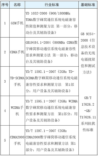 不同製式的手機電磁兼容測試時,選擇不同的行業標準,依據的基礎標準相同,見下表1。