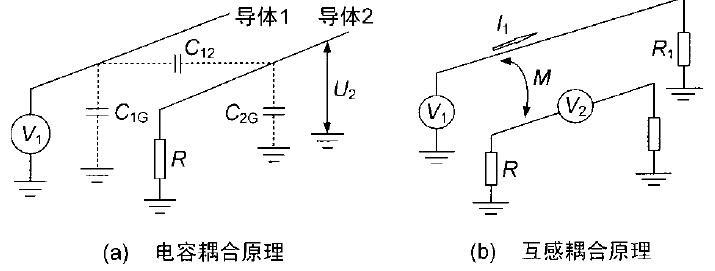 電感耦合原理如圖1(b)所示,當幹擾回路1 中有交變電流流過時,會產生交變磁能,交變磁通穿過回路2 並在回路2 中產生感應電動勢,可表示為: