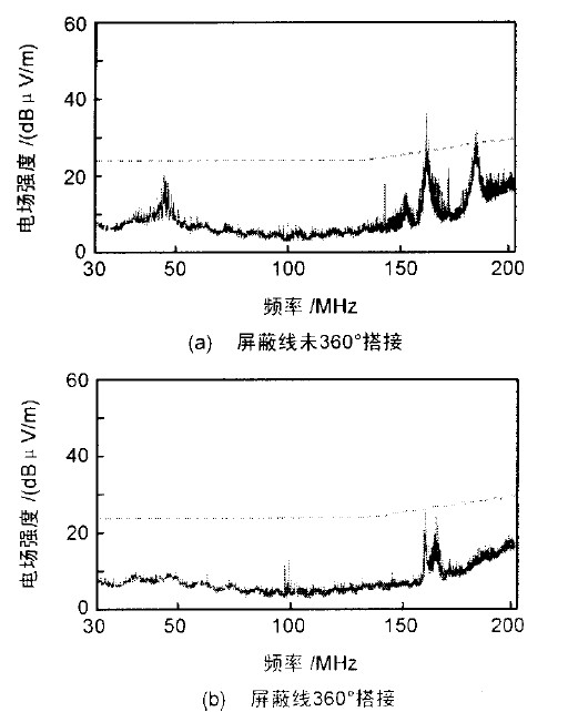 減小空間輻射測試曲線如圖4 所示。圖4(a)是一台外接屏蔽電纜的設備的測試曲線,電纜與接口連接器相連的地方都是將屏蔽層擰成一條小辮(又稱Pigtail),ranhougudingdaolianjieqideluodingshang。pingbidianlannengkongzhigongmofusheshiyinweigongmodianliutigongleyigedizukangtonglu,shigongmodianliutongguopingbicengliuhuigongmodianyayuan。dianlanpingbicengtigongdegongmodianliutongludezukangyoudianlanbenshendezukangjidianlanyujinshujixiangzhijiandedajiezukang2 部分組成。因為電纜與金屬機箱之間的搭接阻抗(Pigtail的阻抗)jiaoda,zhejiushidepingbicengshangxingchengleyigejiaodadegongmodianya,zaigaidianyadequdongxia,dianlanpingbicengshanghuichanshenggongmodianliu,yinerpingbicengbianchengletianxianxiangwaifushe。jiangPigtail連接改成360 壓接在連接器的金屬外殼上,保證低阻抗搭接,測試結果如圖4(b)所示。