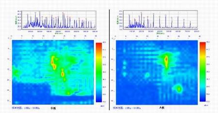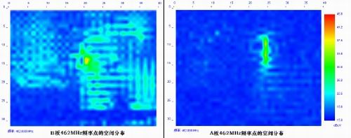 從空間圖中可以看出A板的總的電磁幹擾分布區域比B板的小得多。再來看看某一個頻率點的電磁幹擾分布情況。從圖8所示的462MHz這一個頻率點的電磁幹擾分布情況來看,A板的幅度小,而且區域很小。B板的幅度大,而且分布區域特別廣。