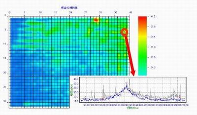 在執行頻譜/空間掃描功能時,把工作著的PCB放置到掃描器上,PCB被掃描器的柵格劃分為7.6mm×7.6mm的小格(每個小格含有一個H場探頭),執行對每個探頭的全頻段掃描(頻率範圍可以從10kHz-3GHz)後,Emscan最終給出兩張圖,分別為合成頻譜圖(圖1)和合成空間圖(圖2)。
