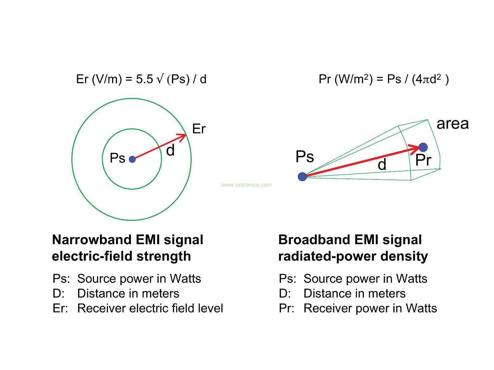 呈輻射狀的電磁幹擾(EMI) 信號會從輻射源傳播至某個接收單元。根本而言,這些信號的功率或者電壓強度在“觸及”敏感的電路時,取決於發送器的功率/天線增益以及輻射源和接收器之間的距離(請參見圖1)。