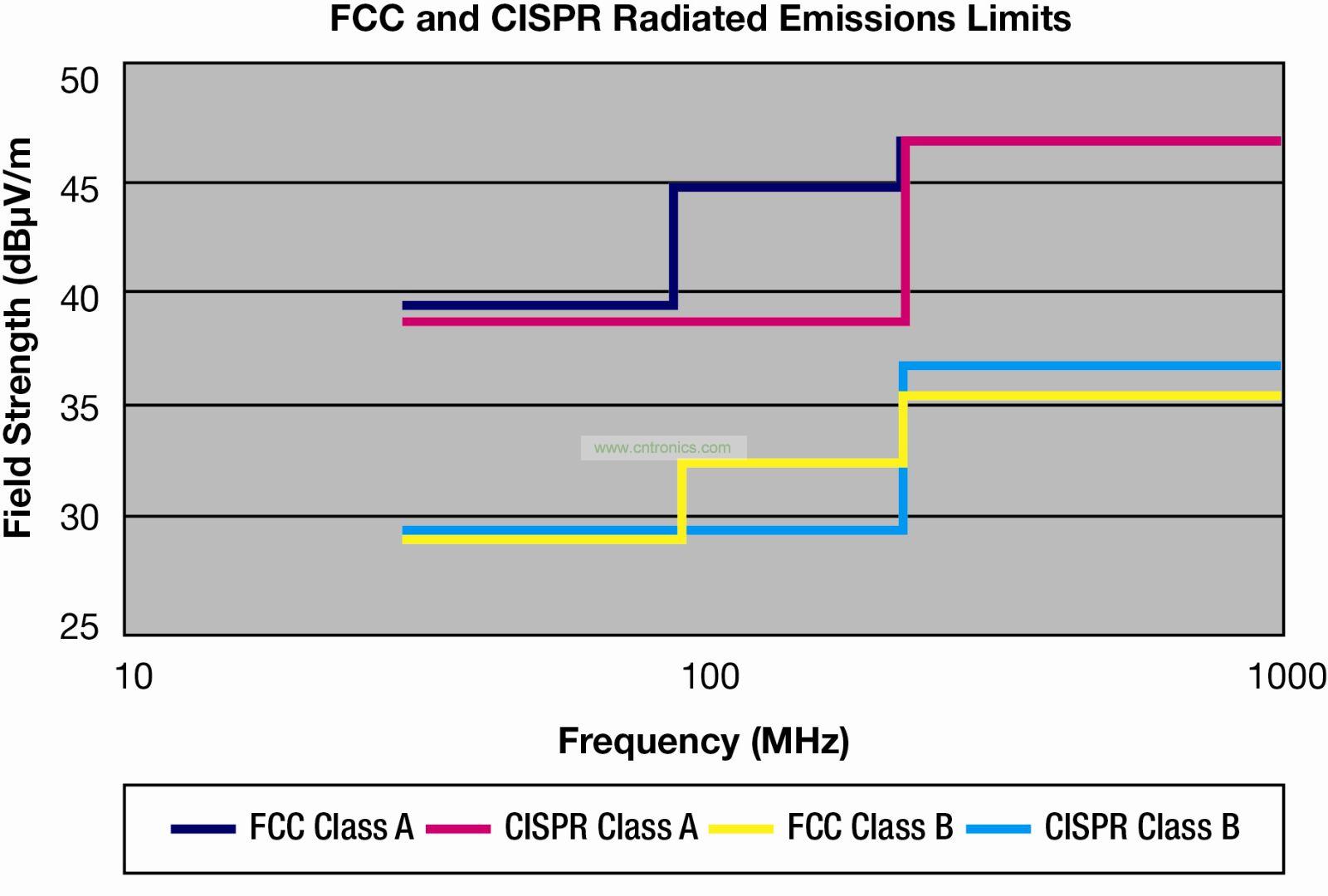 圖2 FCC 和CISPR 輻射限製—30MHz到1GHz,測量距離10m