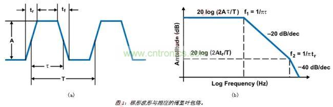 觀guan察cha頻pin域yu時shi,可ke看kan出chu相xiang等deng上shang升sheng和he下xia降jiang時shi間jian的de梯ti形xing波bo形xing是shi由you不bu同tong的de諧xie波bo信xin號hao所suo組zu成cheng,這zhe些xie信xin號hao存cun在zai於yu周zhou期qi信xin號hao基ji本ben頻pin率lv的de整zheng數shu倍bei數shu。值zhi得de注zhu意yi的de是shi,各ge諧xie波bo的de能neng量liang會hui在zai1/(π×τ)的第一個轉折點(導通時間)減至20dB/dec,並且在1/(π×tr)的第二個轉折點減至40dB/dec。因(yin)此(ci),限(xian)製(zhi)開(kai)關(guan)節(jie)點(dian)波(bo)形(xing)的(de)斜(xie)率(lv)會(hui)對(dui)減(jian)少(shao)發(fa)射(she)量(liang)具(ju)有(you)重(zhong)大(da)影(ying)響(xiang)。通(tong)過(guo)這(zhe)項(xiang)探(tan)討(tao),應(ying)該(gai)能(neng)夠(gou)清(qing)楚(chu)顯(xian)示(shi)降(jiang)低(di)運(yun)作(zuo)頻(pin)率(lv)也(ye)有(you)利(li)於(yu)減(jian)少(shao)發(fa)射(she)量(liang)。