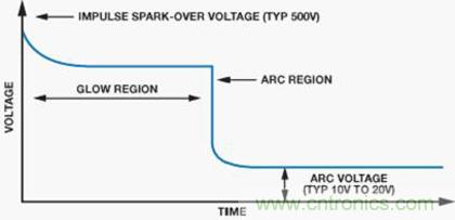 圖9顯示GDT的典型特性。當GDT兩端的電壓增大時,放電管中的氣體由於產生的電荷開始電離。這稱為輝光區。在此區域中,增加的電流將產生雪崩效應,將GDT轉(zhuan)換(huan)為(wei)虛(xu)擬(ni)短(duan)路(lu),允(yun)許(xu)電(dian)流(liu)通(tong)過(guo)器(qi)件(jian)。在(zai)短(duan)路(lu)事(shi)件(jian)中(zhong),器(qi)件(jian)兩(liang)端(duan)產(chan)生(sheng)的(de)電(dian)壓(ya)稱(cheng)為(wei)弧(hu)電(dian)壓(ya)。輝(hui)光(guang)區(qu)和(he)電(dian)弧(hu)區(qu)之(zhi)間(jian)的(de)轉(zhuan)換(huan)時(shi)間(jian)主(zhu)要(yao)取(qu)決(jue)於(yu)器(qi)件(jian)的(de)物(wu)理(li)特(te)性(xing)。
