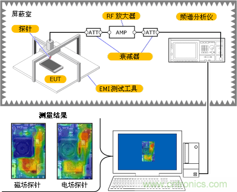 我們將EMI測試工具的電場探針和磁場探針通過RF放大器連接到頻譜分析儀,並對相鄰電磁場的分布進行了分析。
