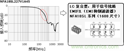 信號頻率為12MHz,同去除噪音所必須的頻帶700MHz相比頻率較低,為了接近信號頻率通過所必須的頻帶 (~100MHz) ,選擇了插入損耗曲線變化急劇,對信號頻率和噪音頻率選擇度較高的LC複合型EMI濾波器。因為信號線路很多,所以EMI濾波器為排容型NFA18SL係 列。在檢查靜噪效果和信號質量之間平衡的同時,我們選擇了220MHz的截止頻率。