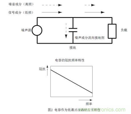 低di通tong濾lv波bo器qi如ru果guo要yao利li用yong該gai特te性xing,就jiu需xu要yao將jiang電dian容rong插cha入ru噪zao聲sheng通tong道dao與yu地di線xian之zhi間jian。如ru此ci一yi來lai,低di頻pin信xin號hao能neng夠gou照zhao常chang通tong過guo,高gao頻pin噪zao聲sheng成cheng分fen因yin接jie地di側ce的de阻zu抗kang較jiao低di,將jiang流liu向xiang接jie地di側ce,從cong而er達da到dao降jiang噪zao效xiao果guo。