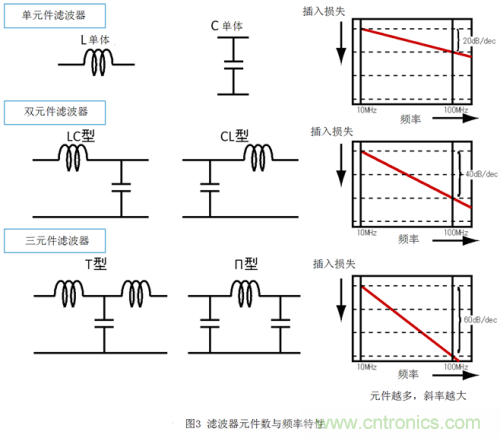 圖 3xianshilezuchenglvboqideyuanjianshuyulvboqipinlvtexingzhijiandeguanxi。xiangzhidaoshenmeshicharusunhao,keyikanyixiatuzhonggelvboqidexinhaoshuaijianliang,tuyuewangxiashuaijianliangyueduo。congtushangwomenke 以看到,濾波器中的元件越多,頻率特性的斜率就越大。元件較少的濾波器的頻率特性範圍較窄(斜率較小),衰減頻率及通過頻率的選擇度較低,有可能導致部分 信號衰減或者噪聲沒有徹底去除。另一方麵,元件較多的濾波器的頻率特性範圍較寬(斜率較大),頻率的選擇度較高,信號可以在幾乎不衰減的狀態下去除噪聲。