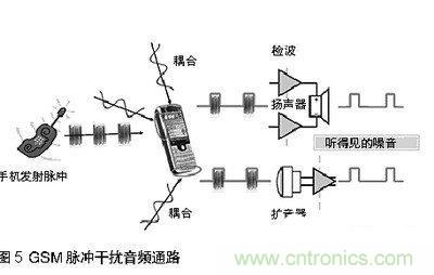 當手機與基站通訊,或兩個手機彼此接近時,發射脈衝通過擴音器,揚聲器,或頭戴式耳機線傳人音頻通路。見圖5。結果是音頻質量大幅降低。