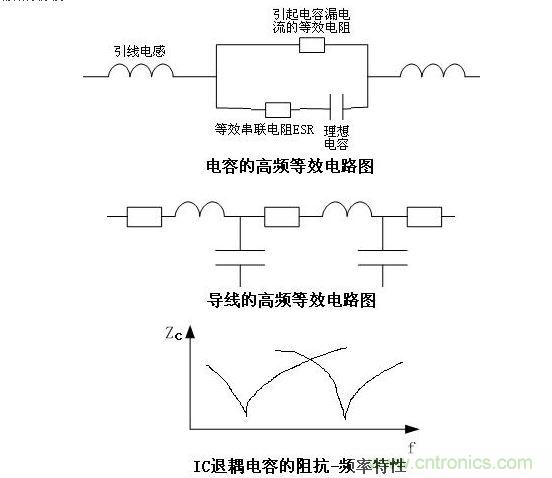 dianrong,zaizhongdipinhuozhiliuqingkuangxia,jiushiyigechunengzujian,zhibiaoxianweiyigedianrongdetexing,danzaigaopinqingkuangxia,tajiubujinjinshigedianrongle,tayouyigelixiangdianrongdetexing,youloudianliu(在高頻等效電路上表現為R),有引線電感,還在導致電壓脈衝波動情況下發熱的ESR(等效串聯電阻),(如圖)。從這個圖上分析,能幫我們設計師得出很多有益的設計思路。第一,按照常規思路,1/2πfcshidianrongderongkang,yinggaishipinlvyuegao,rongkangyuexiao,lvboxiaoguoyuehao,jiyuegaopindezaboyuerongyibeixiefangdiao,danshishibingfeiruci,yinweiyinxiandiangandecunzai,yizhidianrongjinjinzaiqi1/2πfc=2πf L等式成立的時候,才是整體阻抗最小的時候,濾波效果才最好,頻率高了低了都會濾波效果下降,由此就可以分析出結論,為什麼在IC的VCC端都會加兩支電容,一支電解的,一支瓷片的,並且容值一般相差100倍以上多一點。就是兩支不同的電容的諧振頻率點岔開了一段距離,既利於對稍高頻的濾波,也利於對較低頻的濾波。