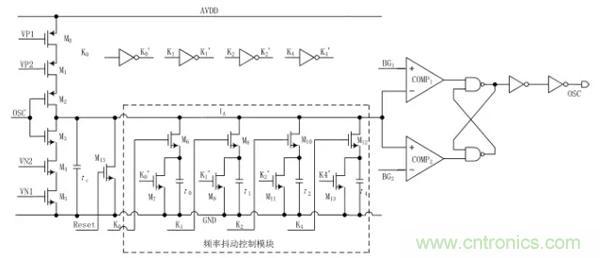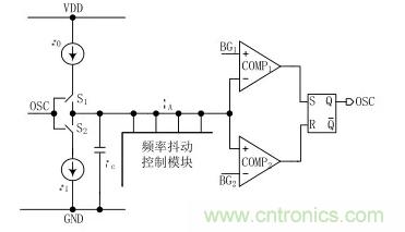 由圖1可以看出,頻率抖動振蕩器由一個張弛振蕩器加上一個頻率抖動模塊構成。其工作原理:首先,開關 S1閉合,電流源 I0給電容 Cc充電,充電剛開始時電容 Cc上極板的電壓小於 BG1和 BG2,RS 觸發器的輸出被置為低電平 0,當電容上極板電壓 VA大於 BG2時,RS 觸發器的輸出狀態處於保持狀態,直到上極板電壓 VA大於 BG1之後 RS 觸發器的輸出翻轉被置為高電平1;此時,開關 S2導通,電流源 I1給電容Cc放電,當VA減小到小於 BG1時,RS 觸發器的輸出處於保持狀態,當VA減小到小於 BG2時,RS 觸發器翻轉被置為低電平 0 ;於是,開關 S1又閉合開始對 Cc充電,如此周而複始,得到一個頻率固定的振蕩器。圖1中的電流源I0、 I1的電流相等,則振蕩器的占空比為 0.5。頻率抖動控製模塊是通過計數器來周期性的切換加入到張弛振蕩器中充放電電容的大小,改變電壓 VA的充放電速度,從而來達到周期性的改變振蕩器頻率的目的,即實現了振蕩器頻率的抖動。