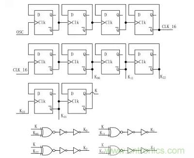 本文中所設計的頻率抖動控製模塊是通過計數器來控製圖 2 中 M6~ M12開關管的通斷來周期性的改變充放電電容的大小來實現的。頻率抖動控製模塊的電路圖如圖 3 所示,由7 個 D 觸發器串聯構成 512 分頻觸發器,第 8 個 D 觸發器的輸出信號加入到異或門用於實現計數器 K4,K2,K1,K0加(jia)減(jian)法(fa)計(ji)數(shu)切(qie)換(huan),保(bao)證(zheng)加(jia)入(ru)到(dao)張(zhang)弛(chi)振(zhen)蕩(dang)器(qi)中(zhong)的(de)電(dian)容(rong)不(bu)會(hui)出(chu)現(xian)瞬(shun)時(shi)的(de)大(da)容(rong)值(zhi)的(de)變(bian)換(huan),從(cong)而(er)引(yin)起(qi)振(zhen)蕩(dang)器(qi)的(de)振(zhen)蕩(dang)頻(pin)率(lv)有(you)過(guo)大(da)的(de)變(bian)化(hua)。本(ben)文(wen)中(zhong)所(suo)設(she)計(ji)振(zhen)蕩(dang)器(qi)的(de)中(zhong)心(xin)頻(pin)率(lv)為(wei)100 kHz,頻率抖動範圍為±4 kHz,頻率從 96 kHz,100 kHz,104 kHz 周期性地變化,頻率抖動周期為 5 ms。
