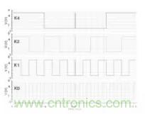 頻率抖動模塊的輸出仿真波形如圖 5 所示,計數器 K0,K1,K2,K4實現了加減法交替功能,從而周期性頻率抖動振蕩器的振蕩頻率為平穩的完成周期性的變化。