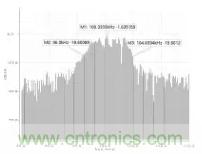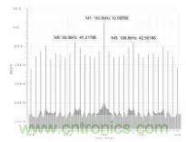 圖 6、圖 7 分別為對不加頻率抖動和加了頻率抖動進行傅裏葉分析的頻譜圖,對比圖 6 和圖 7 可以看出加了頻率抖動電路之後在固定頻率處的頻譜幅值下降了大約11 dB,由此可見頻率抖動電路對減小 EMI 的效果非常明顯。
